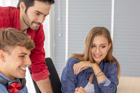 Smiling young office colleagues collaborating and sharing ideas joyfully