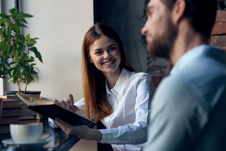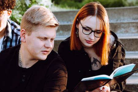 Two young women sitting at the table and reading a book together, they preparing for homework