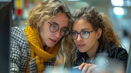 Two young women are sitting together, focusing intently on a computer screen in front of them. They appear engaged in a conversation or task as they study the content displayed.