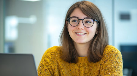 A young woman with glasses smiles while sitting at a desk. She is dressed in a cozy yellow sweater and appears focused in a modern office setting during daylight hours.
