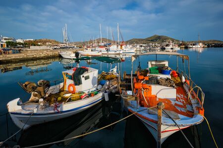 Fishing boats in port of Naousa on sunrise. Paros lsland, Greece