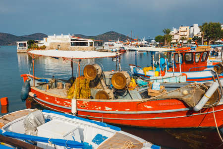 Crete, Elounda, June 07, 2017: Ships and fishing boats in the harbor of Elounda, Crete, Greece