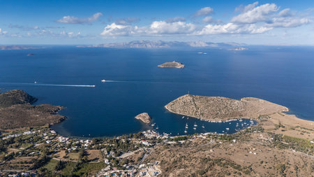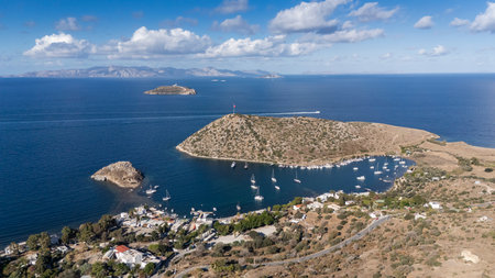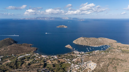 Kythira island, Greece. Aerial drone view of Kythera Chora and castle and Kapsali twin bay coast, Calm Aegean sea and cloudy blue sky