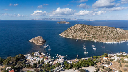 Kea Tzia island. Greece, Cyclades. Drone, aerial view Vourkari marina and Gialiskari village, Blue cloudy sky, rippled sea water background.