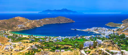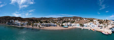 Greece, Kimolos island, Cyclades. May 18, 2021. Psathi port panoramic aerial drone view, sunny day. Rocky landscape, Cycladic traditional architecture, sandy beach, calm sea, blue sky