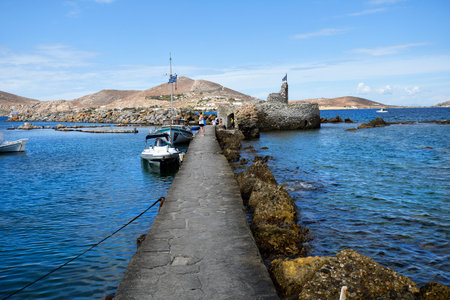 Paros, Greece - September 18, 2024: Unidentified tourists at the old Venetian fortress from 15th century, accessible via a narrow causeway from the port of Naoussa