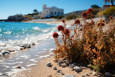 Golden Beach of Rhodes, with chapel at the top of the hill., generative AI