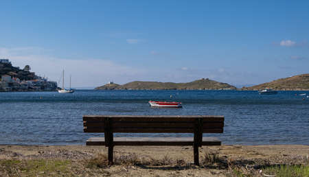 Empty bench at a sandy beach at Tzia, Kea island in Greece, moored boats, blue sea and sky background at Vourkari port,