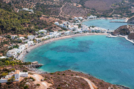Kythira island, Greece. Aerial drone view of Kapsali twin bay coast, beach and village. Sunny summer day