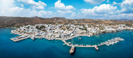 Panoramic aerial view of Adamas town, the port of Milos island, with turquoise sea and sailing boats and yachts anchored in the marina, Cyclades, Greece
