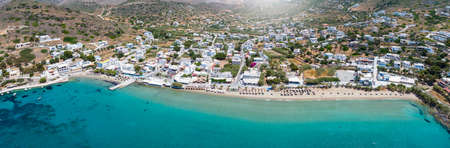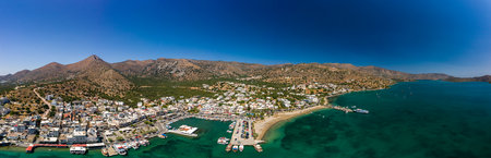 ELOUNDA, CRETE, GREECE - JULY 16 2019: Aerial view of the popular high-end tourist town of Elounda on the Greek island of Crete in the Aegean Sea.