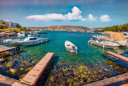 Sunny summer view of Porto Rafti port. Wonderful morning seascape of Aegean sea, Greece, Europe. Travel concept background.