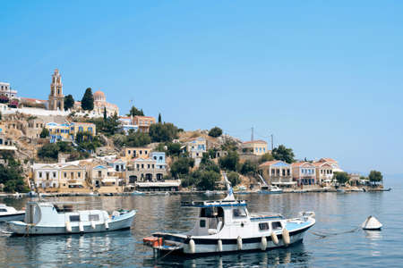 Symi, Greece - June 27, 2019: View of the coast of Symi island with town with multicolored houses, trees and peoples and bay with boats in summer day