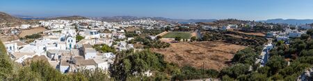 Panorama with Houses, church and buildings in Plaka village, Milos, Greece
