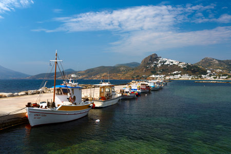 Tranquil Greek fishing village with whitewashed houses fishing boats