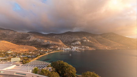 Panorama showing orange clouds during sunset on Amorgos island aerial timelapse from above. Traditional Greece - white houses on hills and turquoise sea, Cyclades