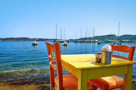 Colorful chairs and tables of Greek tavern by waterfront at day. Vacations, Greece, summer, restaurant, outdoor dining, islands, port, marina, yachts