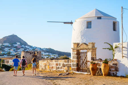 Back view of father and two kids on Milos island vacation in Greece walking by traditional white windmill