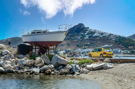 Repairing sail boat and a yellow car in the harbor of Skyros island, Greece