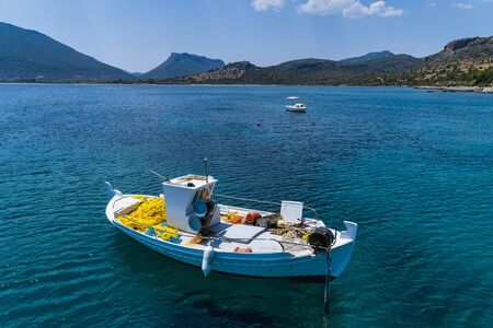 Aerial photo top view of small traditional fishing boat in tropical emerald and turquoise clear sea. Peloponnese, Greece