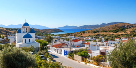 A vibrant Greek island village with whitewashed buildings, blue-domed churches, and a stunning view of the Aegean Sea under a clear blue sky. The picturesque setting feels idyllic.