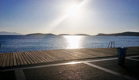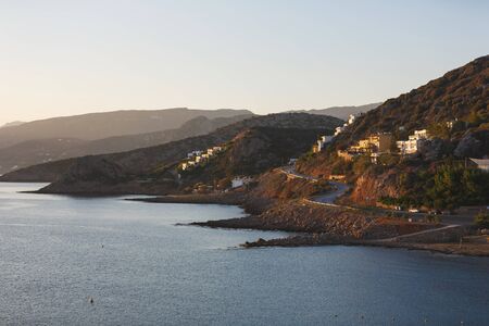 Vintage seascape and coastal nature background. Blue sea and mountains in the morning as art print