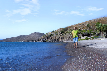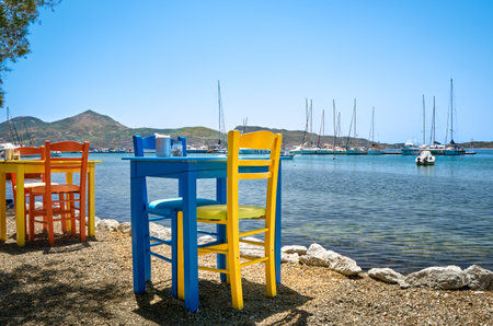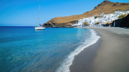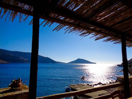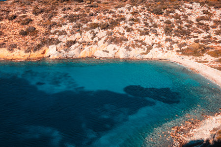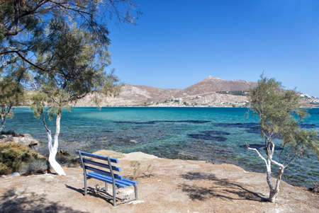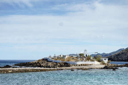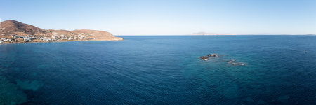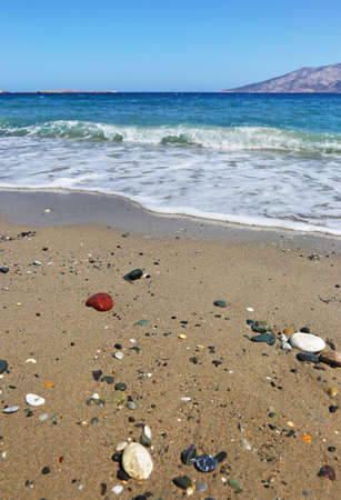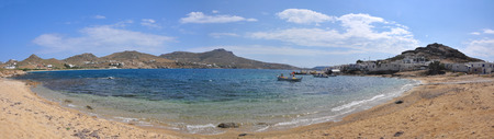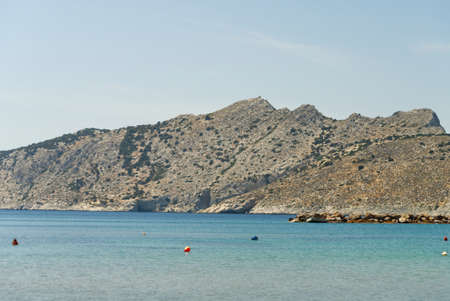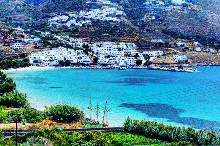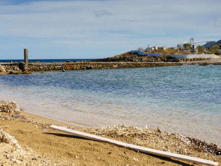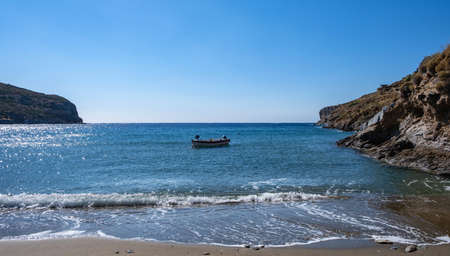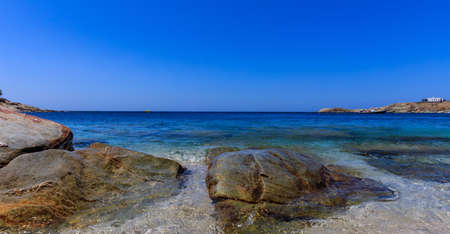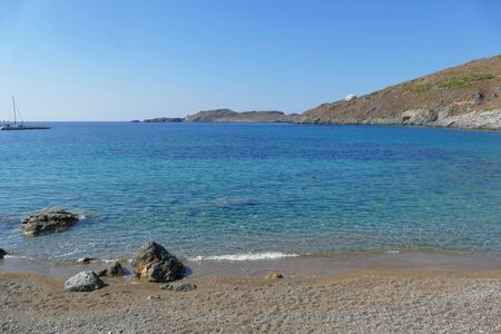 Greek island, Sikinos Beautiful bay, with blue sea lapping on the beach Landscape aspect view with clear sky Copy space