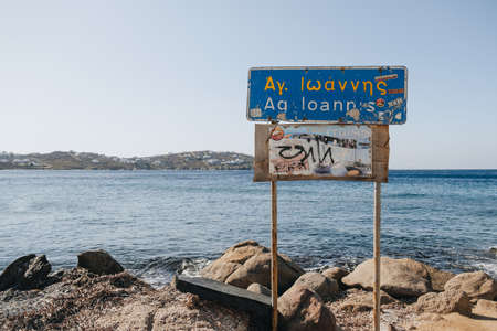 Agios Ioannis, Greece - September 24, 2019: Sign by the Agios Ioannis beach, a beach named after a small chapel standing above it, looking out to the historic island of Delos.