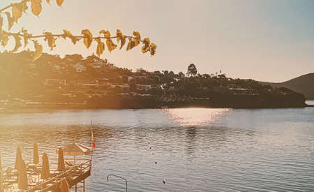 Tranquil seascape and coastal nature concept. Sea, boats, mountains and blue sky over horizon at sunset