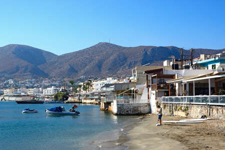Crete island, Greece: Wide angle cityscape showing blue mediterranean beach near heraklion city with tourist during summer