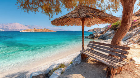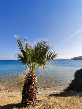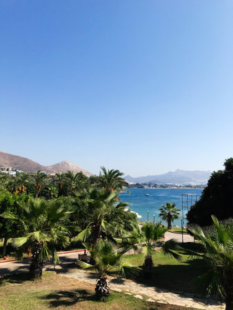 A vibrant tropical beach scene with lush palm trees, a clear blue sky, and distant mountains. The serene bay invites relaxation and a sense of tranquility by the sea. Bodrum, Turkey.