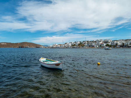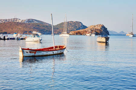 Small boat on the sea, reflections on calm sea water, blue clear sky background, Spathi sandy beach. Greece. Kea island.
