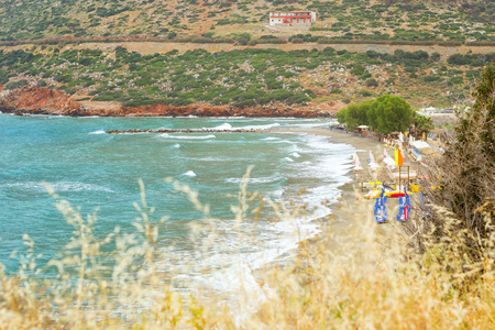 Sunny sandy Livadi beach in sea bay of resort village Bali. Views of mountain, shore, washed by waves and sun loungers with parasols where sunbathing tourists. Bali, Rethymno, Crete, Greece