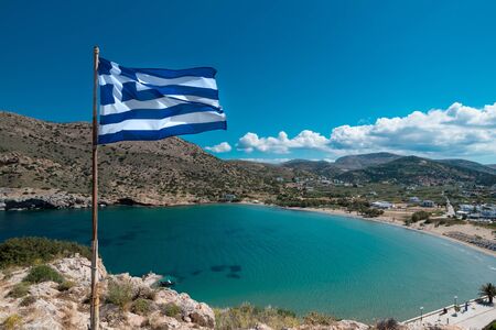 Amazing view of Galissas beach with the Greek flag in the foreground and the town and mountains in the background, Syros island, Cyclades archipelago, Greece - Image