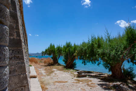 Agios Fokas region of Monemvasia. Greek coastline with small cemetery on sea shore, Maleas peninsula region Peloponnese