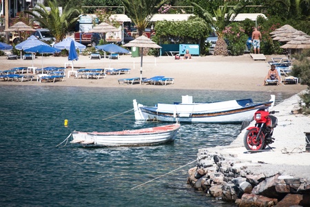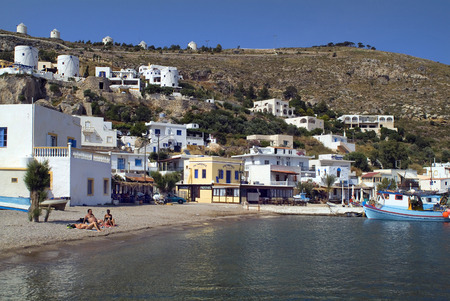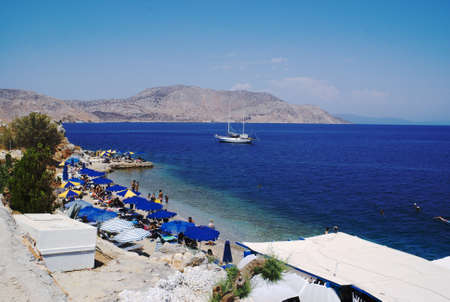 Panteli, Greece - May 21st 2009: Unidentified people on beach in tiny fishing village on Leros island