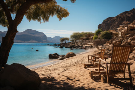 Vintage travel card and hot summer concept. Beach pier with sunbeds and umbrellas at luxury beachfront resort by the sea in summertime