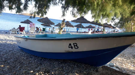 Greece, the island of Telendos in the Dodecanese chain of islands in the Aegean sea. A little boat is docked by the seashore