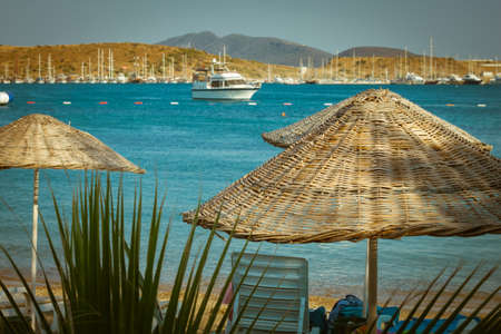 Thatched sun umbrellas, beach umbrellas on the sea background with blurred yachts. color tonal effect.