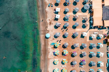 Beautiful sand beach wit parasols. Overhead aerial view. Adriatic sea in Croatia on Pag island.