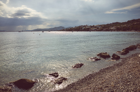 Retro toned picture of a beach at sunset, Mallorca, Spain.