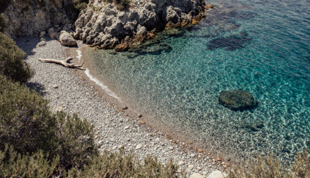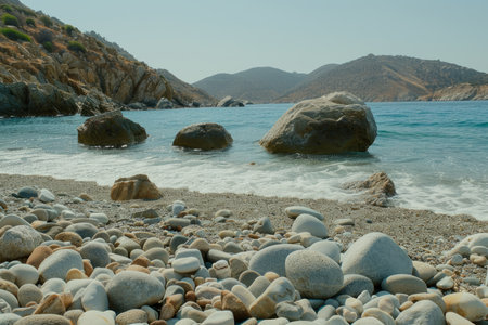 Crystal clear turquoise waters gently lap against a smooth, pebbled shore. The sun shines brightly, illuminating the serene rocky coastline, creating a peaceful atmosphere.