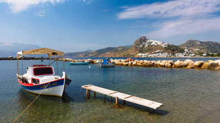 A beautiful view of Nikouria with wooden dock and mountains on the backgrounds in Amorgos Island