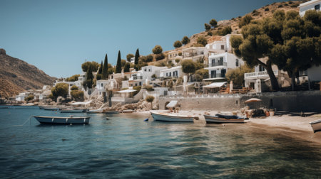 Tranquil Greek fishing village with whitewashed houses fishing boats