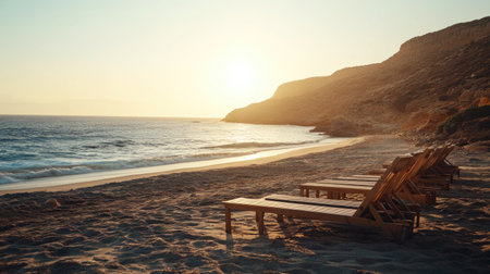 Enjoy a tranquil scene of a beach at sunset, featuring lounge chairs lined up on soft sand. Gentle waves lap against the shore, creating a soothing atmosphere.