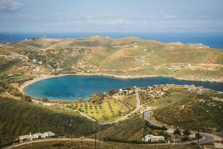Panoramic aerial view of the bay and beach at Kini, Siros island, Cyclades, Greece, with turquoise sea