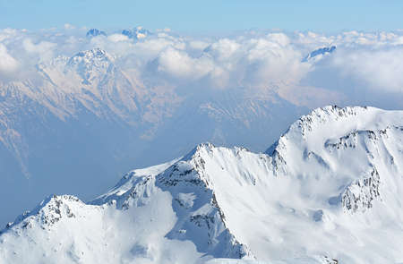 Mountain peaks in the clouds. Caucasus Mountains, Georgia, region Gudauri.
