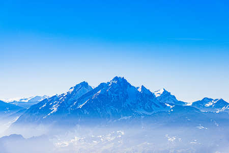Majestic unique misty blue alpine skyline view panorama of Mount Pilatus and blue sky, Lucerne, Switzerland.