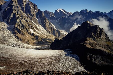 Sunset light over retiring dying glaciers on the Italian French Alps. Climate change concept. Toned desaturated image.