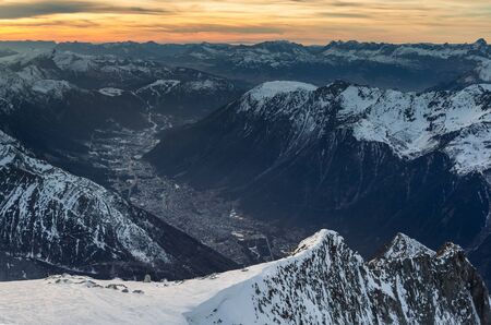 Aiguilles Rouges Red Peaks in French Alps in dusk, aerial view from Mont Blanc
